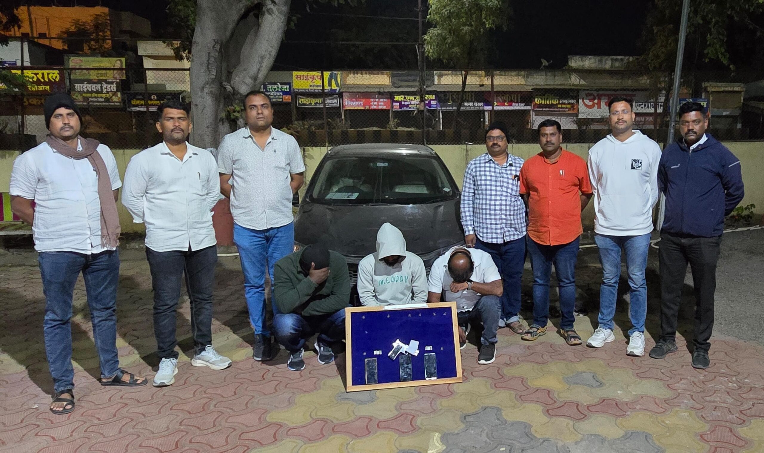 पथकाने मिळालेल्या माहितीचे आधारे श्रीरामपुर ते बेलापुर जाणारे रोडवर अनारसे हॉस्पीटलचे समोर रोडलगत सापळा रचुन थांबले असता बातमीतील वाहन येतांना दिसले. पथकाने सदर वाहन थांबवुन त्यामधील इसमांना त्यांचे नांव गांव विचारता त्यांनी त्यांची नावे 1) आनंदा यशवंत काळे वय – 44 वर्षे, रा. रेणुकानगर, 51 नं. रेल्वे गेट जवळ, श्रीरामपुर, ता. श्रीरामपुर, जि. अहिल्यानगर, 2) विशाल बबन सोज्वळ वय – 28 वर्षे, रा. रेणुकानगर, दत्तनगर रोड, विश्वकर्मा मंदीराचे पाठीमागे श्रीरामपुर, ता. श्रीरामपुर, जि. अहिल्यानगर, 3) विजय यशवंत काळे वय – 48 वर्षे, रा. निलकंठ ड्रिमस् शांताई रेसिडेन्सी शेजारी, थत्ते ग्राऊंड, वार्ड नं. 7 श्रीरामपुर, ता. श्रीरामपुर, जि. अहिल्यानगर असे असल्याचे सांगितले.
